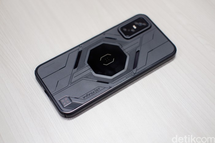 Ini adalah Infinix GT 30 Pro versi Drak Flare. Desain premium yang menonjolkan estetika gaming dipadukan efek pencahayaan dinamis "GT DynaVue" menggunakan teknologi elektrokromik memberikan tampilan unik dengan lampu RGB yang dapat disesuaikan.Foto: Adi Fida Rahman/detikINET
