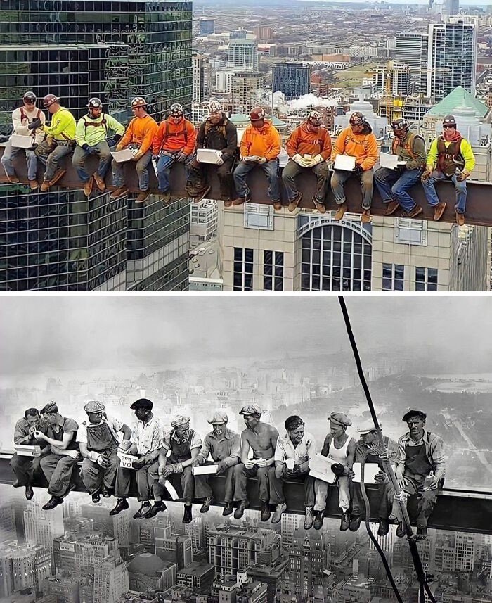 Pekerja di Chicago melakukan remake foto fenomenal 'Lunch Atop A Skyscraper' yang diambil pada 1932. At least, sekarang pakai helm kerja lah, ya. Foto: j0urn3ym4n via Bored Panda