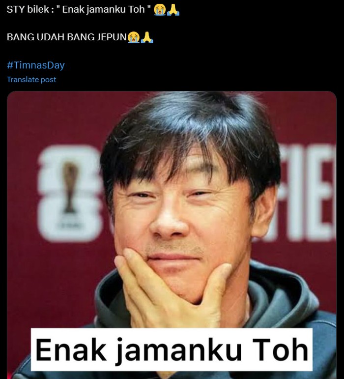 Setiap kali Timnas Indonesia kalah, keluar meme Shin Tae-yong tersenyum. Foto: X.com