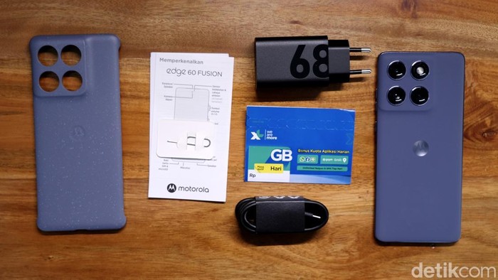 Ini adalah isi paket penjualan Motorola Edge 60 Fusion, yaitu charger 68 watt, kabel USB-C to USB-C, kartu perdana XL Axiata, buku petunjuk, dan colokan kartu SIM. Foto: detikINET/Anggoro Suryo Jati