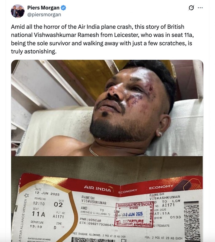 Vishwashkumar Ramesh warga negara Inggris, adalah satu-satunya penumpang selamat dalam kecelakaan pesawat Air India. "Kisah warga InggrisΒ Vishwashkumar Ramesh dari Leicester, yang duduk di kursi 11a, menjadi penyintas satu-satunya dengan hanya beberapa luka, sungguh menakjubkan," tulis presenter kenamaan Piers Morgan.Β Foto: X.com
