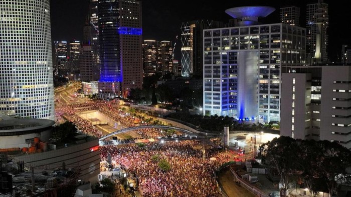 Foto ini diambil pada Sabtu (21/9/2024) silam. Ribuan orang menghadiri protes terhadap pemerintahan Israel di Tel Aviv. Foto: REUTERS/Aviv Atlas/File Foto