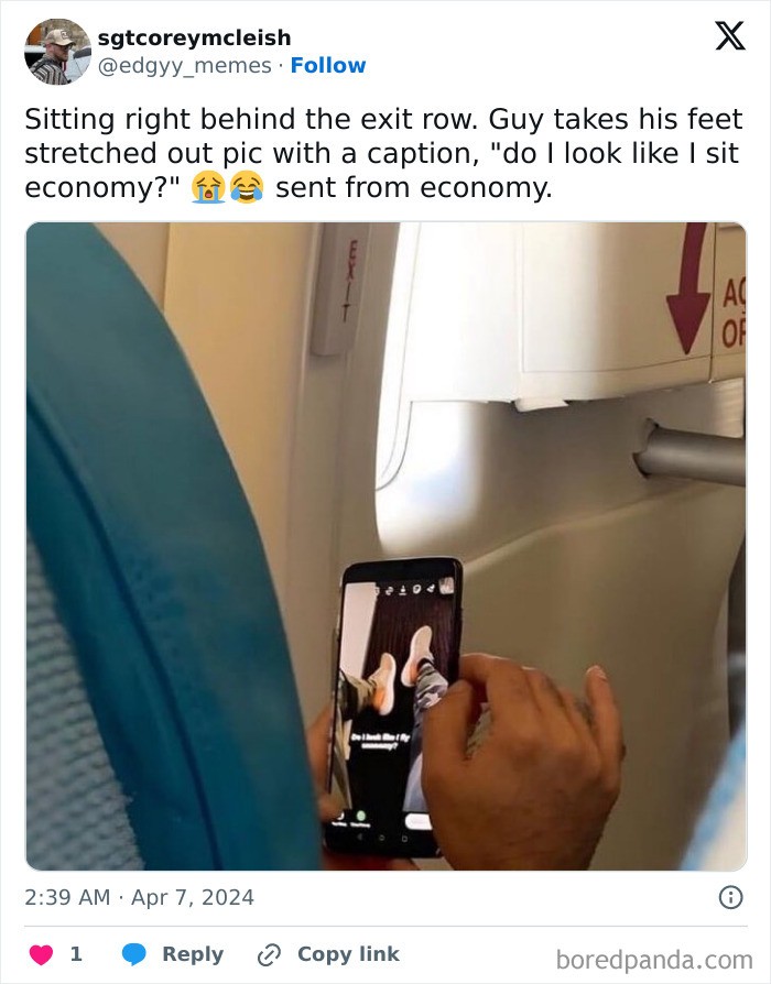 Influencer di pesawat mengambil foto kaki dan berpura-pura duduk di kelas bisnis demi flexing di medsos. Foto: Boredpanda