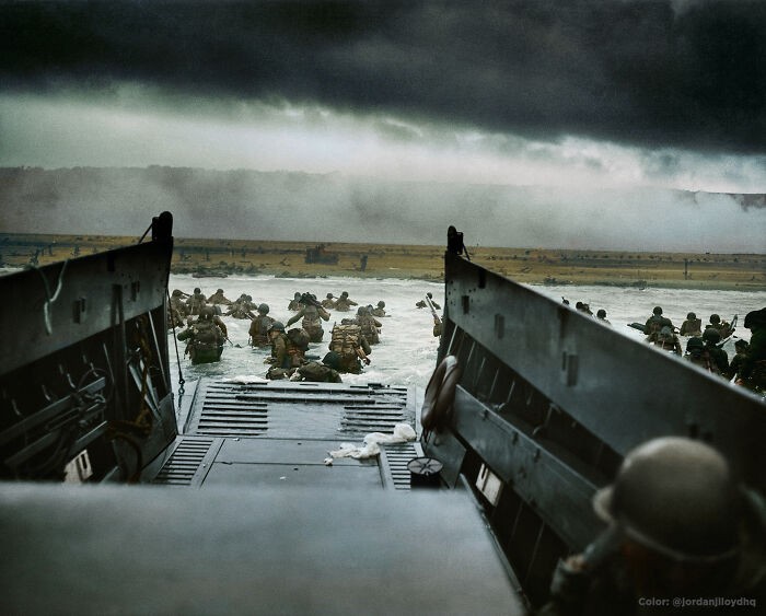 Tentara Amerika berjalan di pantai Normandia pada tanggal 6 Juni 1944, D-Day. Letnan Kolonel SLA Marshall, sejarawan Angkatan Darat di Teater Eropa, mengkritik operasi di Pantai Omaha pada D-Day dan menyalahkan Jenderal Bradley atas kerugian besar yang dialami. Foto: Boredpanda