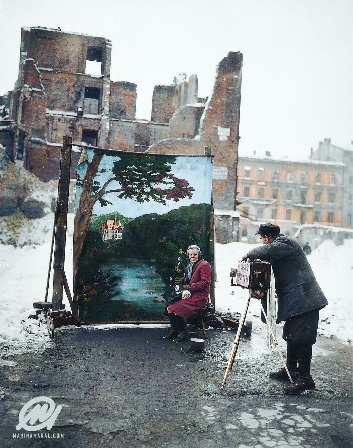 Seorang Fotografer Menggunakan Latar Belakangnya Sendiri Untuk Menyembunyikan Reruntuhan Perang Dunia II di Polandia Saat Mengambil Potret di Warsawa, November 1946 Foto: Boredpanda