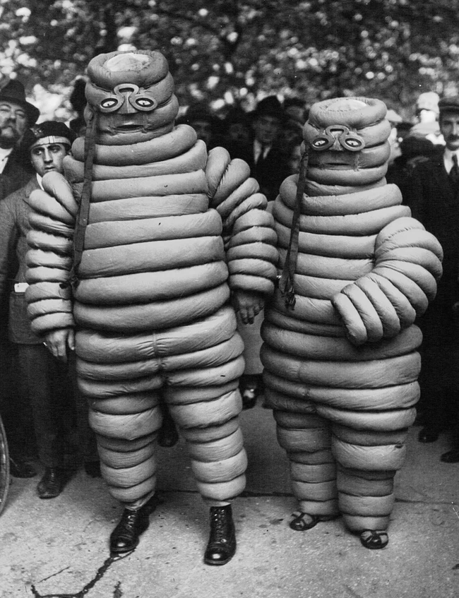 Sebelum menjadi maskot menggemaskan yang kita kenal sekarang, Manusia Michelin —yang awalnya bernama Bibendum— cukup meresahkan. Diperkenalkan pada tahun 1898, ia digambarkan sebagai sosok menjulang tinggi yang terbuat dari tumpukan ban, mengangkat piala berisi paku dan pecahan kaca, yang melambangkan bagaimana ban Michelin dapat "menenggak" bahaya jalan.