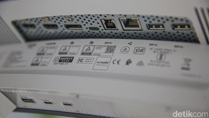 Legion Pro 34WD-10 hadir dengan pilihan port yang lengkap yaitu tiga USB-A, dua USB-C, serta dua port HDMI 2.1, satu DisplayPort 1.4, dan port RJ45 untuk koneksi Ethernet. Foto: Rifkianto Nugroho/detikcom
