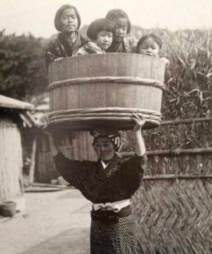 Seorang wanita Jepang menggendong anak-anaknya di dalam ember di atas kepalanya, Jepang, sekitar tahun 1900-an Foto: Boredpanda