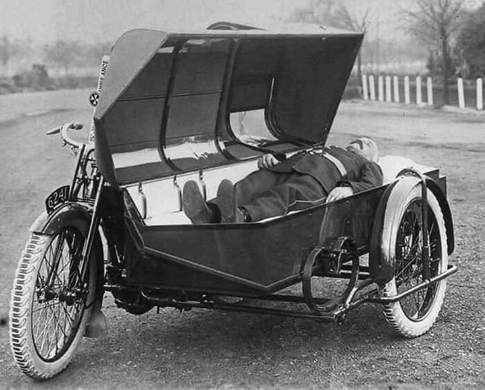 Ambulans Awal yang Dioperasikan Oleh St John, Di Inggris, 1920. Pasien Ditempatkan Di Sidecar Seperti Peti Mati Dan Tutupnya Ditutup Untuk Transportasi Foto: Boredpanda