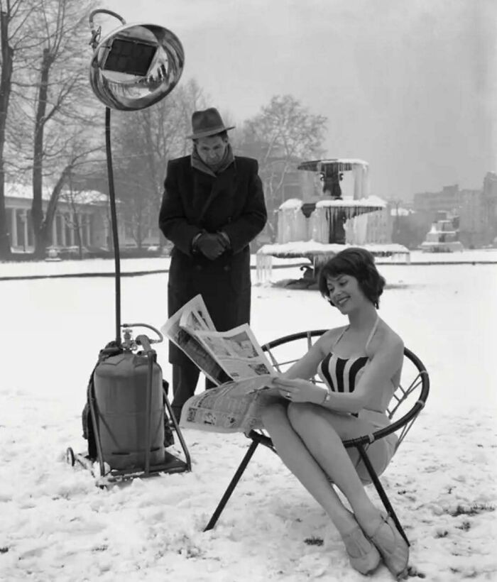 Marion Liebig, Miss Hesse 1959, Tetap Hangat di Bawah Sinar Matahari Buatan Lampu Infra-Merah. Foto Ini Diambil Selama Promosi Lampu Di Taman yang Tertutup Salju di Wiesbaden, Jerman, 1960 Foto: Boredpanda