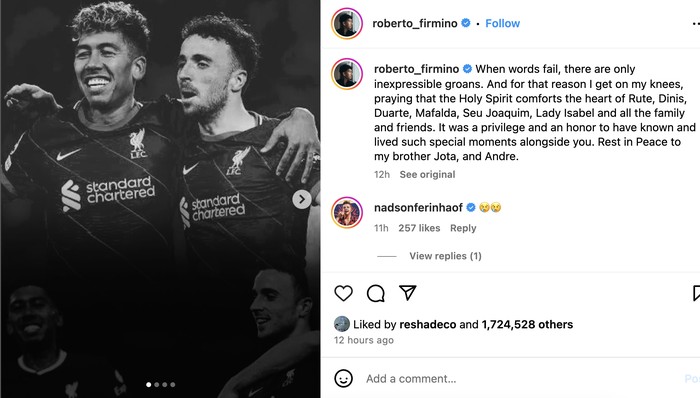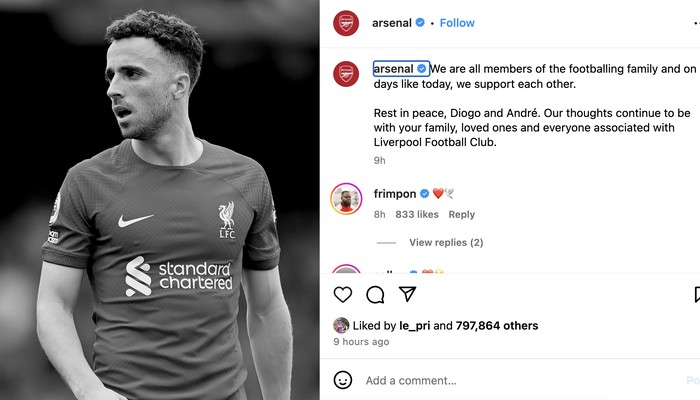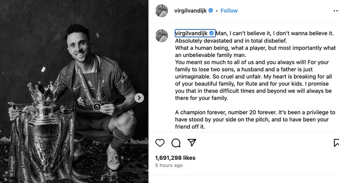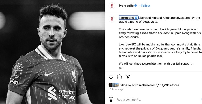 Liverpool sudah banyak memposting pengormatan dan kenangan akan Diogo Jota. "Liverpool hancur karena meninggalnya Diogo Jota secara tragis," tulis mereka. Foto: Instagram