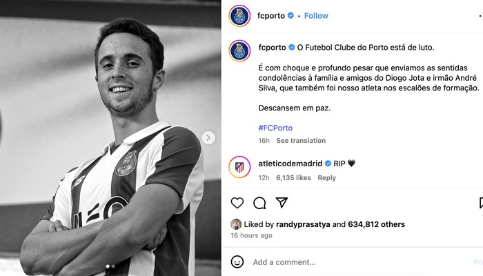 FC Porto yang pernah dibela Jota juga jelas berdukacita. Foto: Instagram