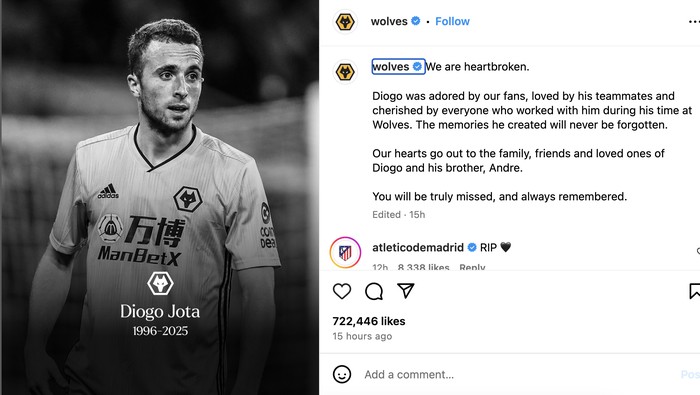 "Kami patah hati. Diogo dikagumi fans kami, dicintai rekan setim dan disenangi setiap orang yang bekerja dengannya selama dia di Wolves," tulis Wolves, klub Jota sebelum Liverpool. Foto: Instagram