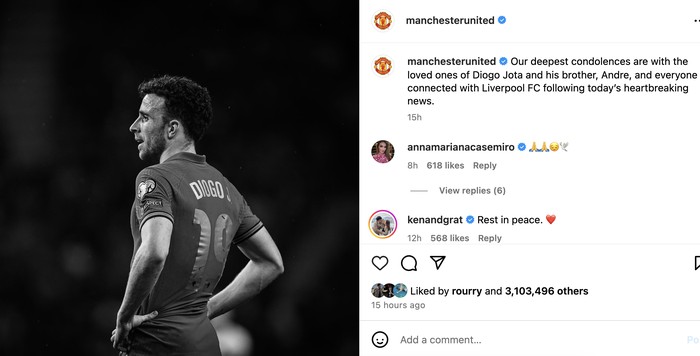 "Duka terdalam kami bersama orang terkasih Diogo Jota dan saudaranya, Andre, dan setiap orang yang terhubung dengan Liverpool FC," sebut Manchester United. Foto: Instagram