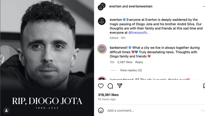 "Setiap orang di Everton sangat sedih karena meninggalnya Diogo Jota dan saudaranya Andre Silva secara tragis," tulis Everton. Foto: Instagram