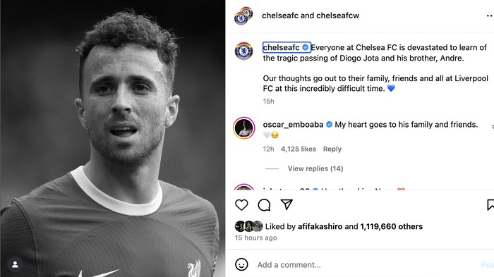 "Setiap orang di Chelsea hancur mendengar kabar meningalnya Diogo Jota dan saudaranya, Andre," cetus Chelsea. Foto: Instagram