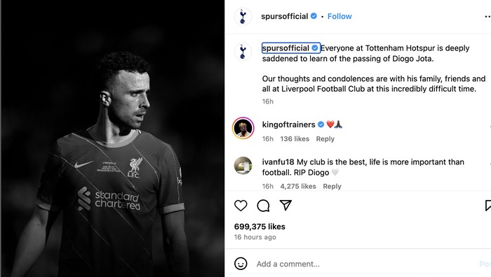 "Setiap orang di Tottenham Hotspur sangat sedir mendengar kabar meninggalnya Diogo Jota," tulis Spurs. Foto: Instagram