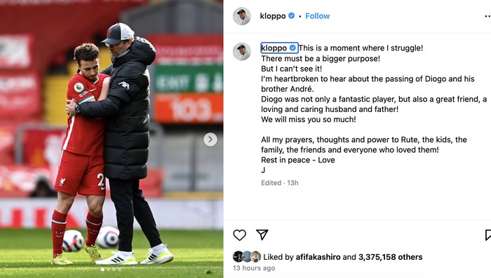 "Saya patah hati mendengar meninggalnya Diogo dan saudaranya. Dia tak hanya pemain fantastis, tapi juga teman yang baik, suami yang penyayang dan seorang ayah," sebut Jurgen Klopp. Foto: Instagram