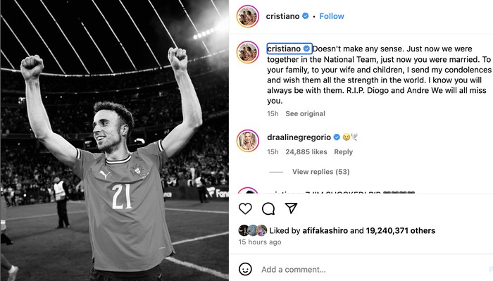 Serta Cristiano Ronaldo. ""Tidak masuk akal. Di saat kita bersama di timnas, di saat kamu baru menikah," sebutnya. Foto: Instagram
