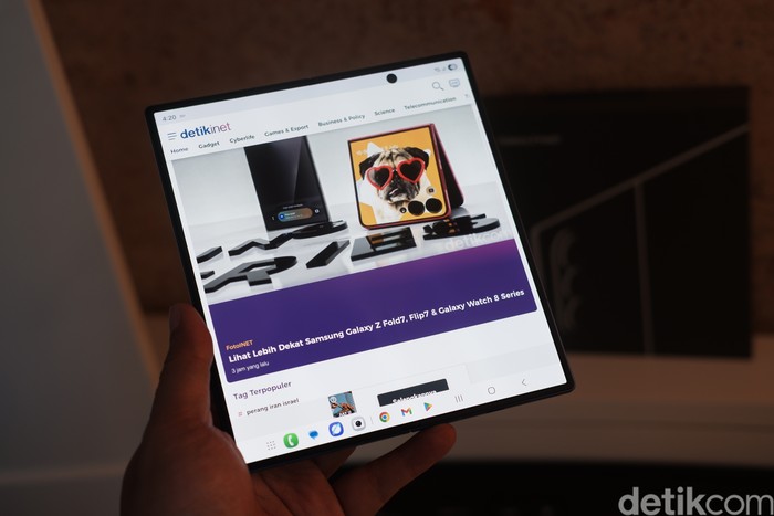Layar luar (Cover Display) kini hadir dengan panel Dynamic AMOLED 2x 6,5 inch yang lebih lebar dan mengusung aspect ratio 21:9, membuatnya terasa sangat familiar seperti smartphone pada umumnya. Mengetik hingga Browse jadi lebih mudah bahkan saat perangkat terlipat, menawarkan pengalaman yang seamless di setiap aktivitas.Foto: Adi Fida Rahman/detikINET