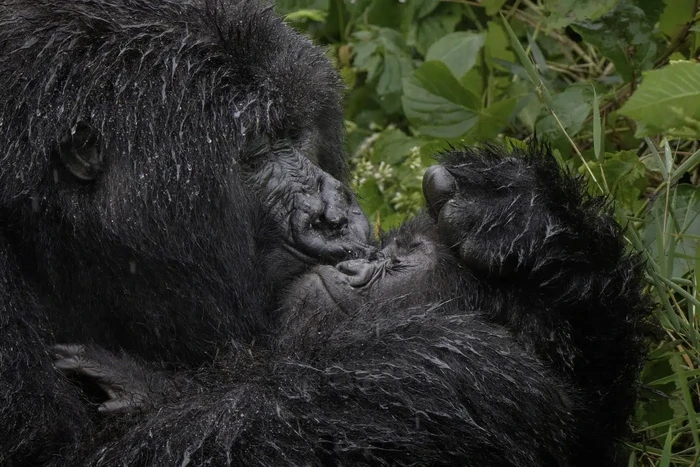 "Aaaaaww Bu!" karya Mark Meth-Cohn (Inggris). Hewan: Gorila. Lokasi pengambilan gambar: Rwanda "Induk gorila yang penuh kasih sayang memberikan ciuman basah yang besar kepada bayinya!" Foto: Nikon Comedy Wildlife Photography Awards