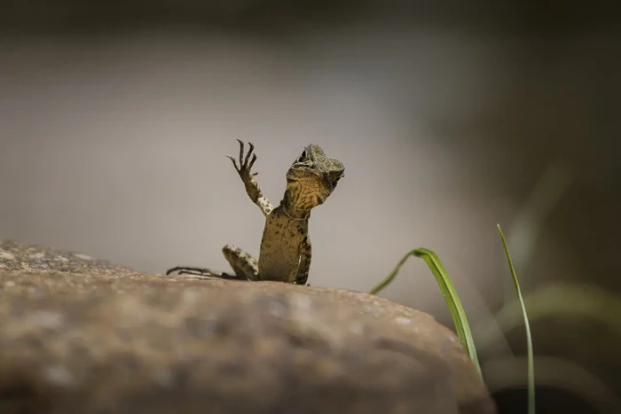 "Waving Dragon" karya Trevor Rix (Australia). Hewan: Naga Air Gippsland. Lokasi pengambilan gambar: Sungai Murrumbidgee dekat Canberra, ACT, Australia. "Saat menyusuri Sungai Murrumbidgee, kami melihat beberapa kadal berlarian di bawah bebatuan mencari makan siang. Tak lama kemudian, Naga Air Gippsland muda ini muncul dan melambaikan tangan ramah kepada kami." Foto: Nikon Comedy Wildlife Photography Awards