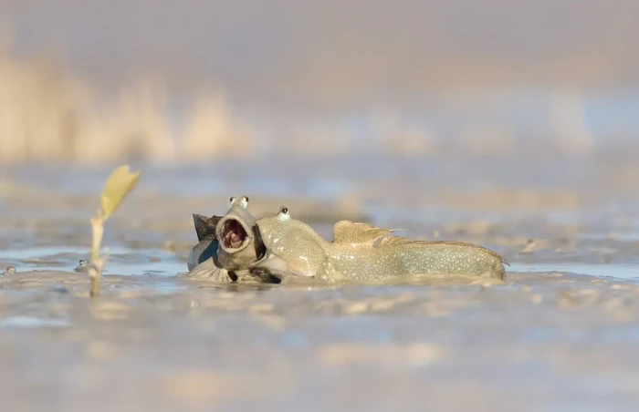 "Tertawalah seperti tak ada yang melihat" oleh Emma Parker (Australia). Hewan: Ikan Gelodok Biru. Lokasi pengambilan gambar: Australia Barat. "Dua ikan gelodok yang riang tampak bersenang-senang di lumpur β saya hanya ingin tahu apa leluconnya! Lumpur itu menyenangkan." Foto: Nikon Comedy Wildlife Photography Awards