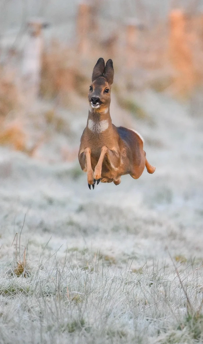 "Rusa Bahagia" karya Jeremy Duvekot (Belanda). Hewan: Rusa roe. Lokasi pengambilan gambar: Belanda. "Rusa roe ini berlarian dengan riang dan tiba-tiba menghampiri saya. Hanya punya satu kesempatan dan berhasil." Foto: Nikon Comedy Wildlife Photography Awards