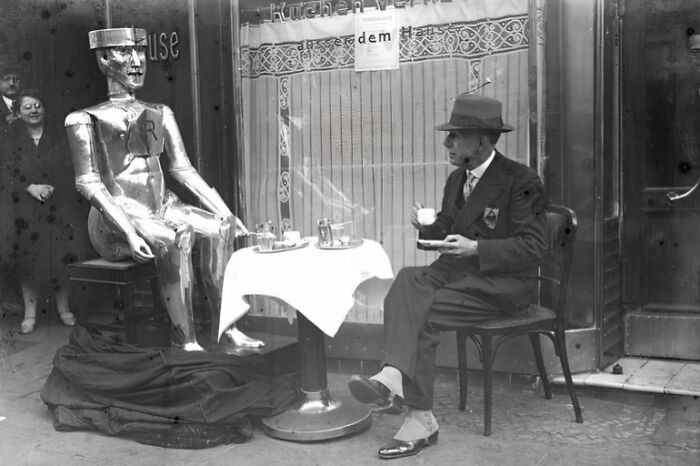 Robot humanoid ER (Elektro Robot) sedang "menemani" minum teh di trotoar Jerman. Salah satu simbol ambisi awal dalam teknologi robotika. Foto: Boredpanda