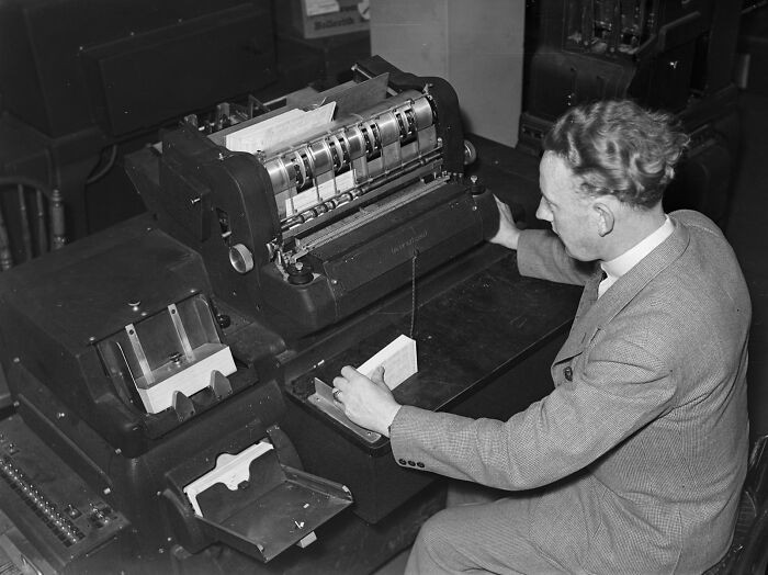 Seorang pria mengoperasikan mesin hitung punch card IBM 401 era 1940-an. Dulu, beginilah cara komputer menghitung data besar sebelum adanya spreadsheet digital. Foto: Boredpanda