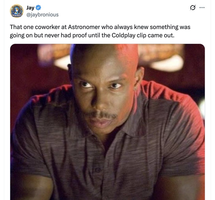 Meme bahwa pegawai di perusahaan sang pria sudah mencium sesuatu yang tidak beres yang akhirnya terbukti di konser Coldplay. Foto: X.com