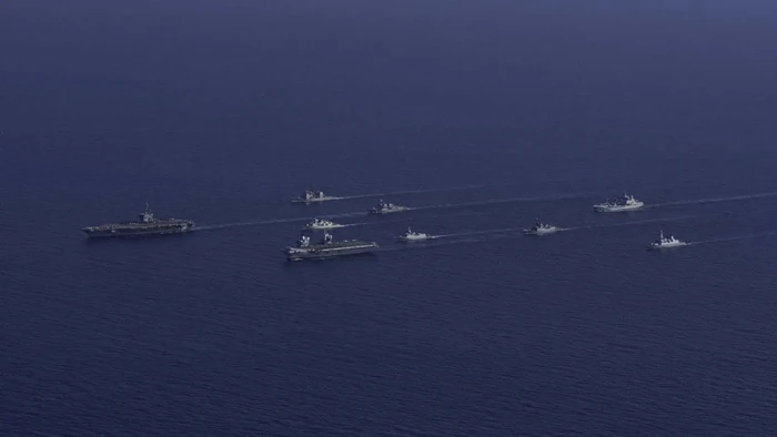 Kapal induk nuklir AS, USS George Washington, dan kapal induk Inggris, HMS Prince of Wales, terlihat memimpin kapal perang lain di Laut Timor. Foto: Royal Navy