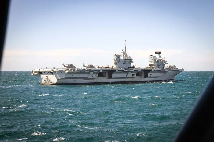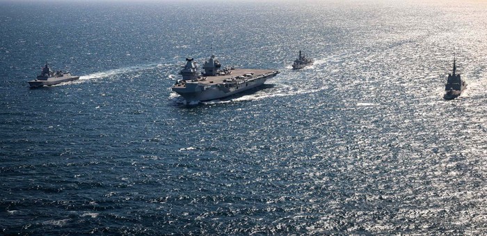 Kapal induk Inggris HMS Prince of Wales dengan jet tempur F-35B Lightning, helikopter Merlin, dan Wildcat menjadi elemen serang kapal induk, didukung oleh kapal perang pengawalnya. Foto: Royal Navy