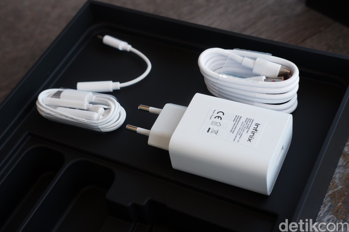 Dalam paket penjualan diberikan aksesori lengkap. Tidak hanya adaptor charger, Infinix menyertakan kabel data, converter dan earphone. Foto: Adi Fida Rahman/detikINET