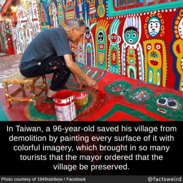 Pelukis berusia 96 tahun menyelamatkan sebuah desa. Awalnya, desa tempat ia tinggal akan dihancurkan. Namun ia melukis setiap sudut desa sehingga tampak indah dan mendatangkan turis. Wali kota setempat akhirnya memutuskan untuk melestarikan desa tersebut.Β Foto: via BoredPanda