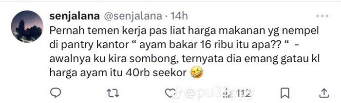 Tidak tahu harga ayam. Makanya kaget begitu tahu ada yang jual ayam bakar Rp 16 ribu. Foto: X/senjalana
