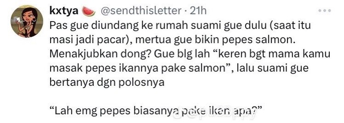Pepes salmon. Kamu biasanya pepes pake ikan apa? Foto: X/sendthisletter