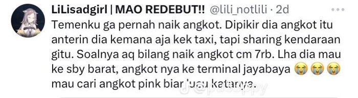 Angkot memang sharing kendaraan, sih. Foto: X/lili_notlili