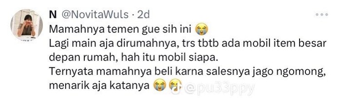 Beli mobil karena sales-nya jago ngomong. Foto: X/NovitaWuls