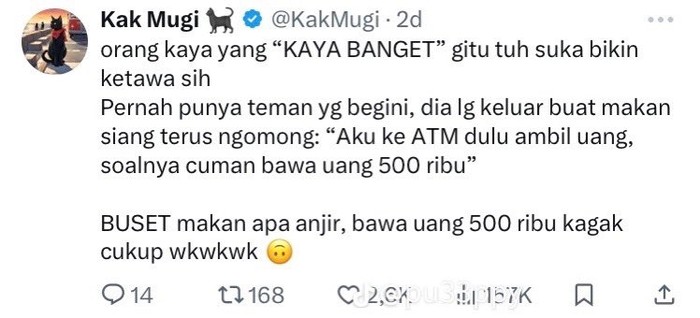 Positive thinking, mungkin mau sekalian traktir teman-temannya. Foto: X/KakMugi