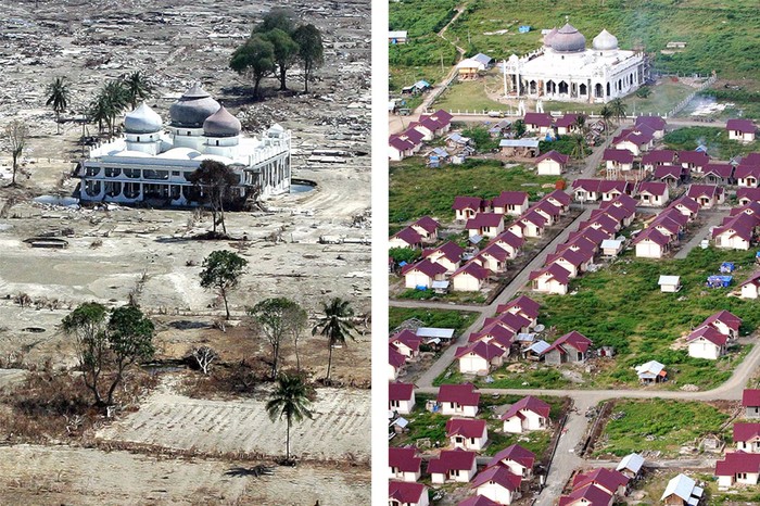 Hampir seluruh bangunan di sekitar masjid di Provinsi Aceh, Indonesia, hancur akibat tsunami Desember 2004, 15 Januari 2005. Kanan: Rumah-rumah baru mengelilinginya pada 8 Desember 2006. Foto: Radio Free Asia