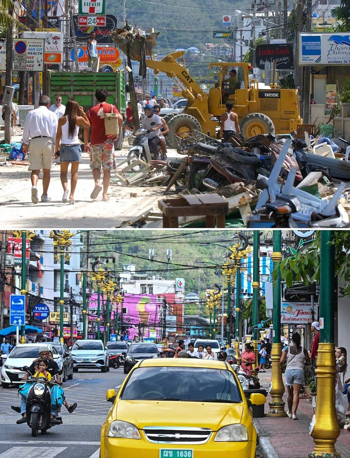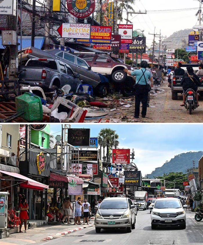 Tsunami Samudra Hindia menyebabkan kendaraan-kendaraan saling menumpuk di Jalan Patong di Phuket, Thailand, 28 Desember 2004. Bawah: Jalan yang sama pada 18 November 2024. Foto: Radio Free Asia