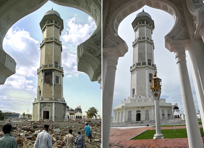 Orang-orang berjalan di antara puing-puing akibat tsunami di Masjid Raya Baiturrahman di Banda Aceh, Indonesia, 28 Desember 2004. Kanan: Masjid tersebut terlihat pada 27 November 2024. Foto: Radio Free Asia