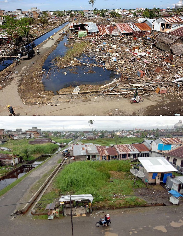 Puing-puing tsunami terlihat di Meulaboh, sebuah kota di Provinsi Aceh, Indonesia, 31 Desember 2004. Bawah: Area yang sama terlihat pada 4 Desember 2005. Foto: Radio Free Asia