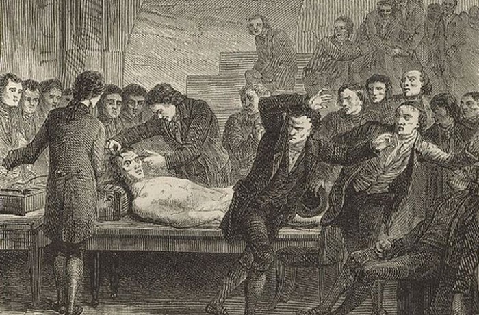 Awal abad ke-19, Robert Knox adalah salah satu dokter paling dihormati di Inggris. Ia pelopor anatomi komparatif yang mengajar di sekolah anatomi terbesar. Knox menghadapi masalah karena kelangkaan mayat. Ia pun menjalin hubungan dengan dua orang bernama Burke dan Hare. Mereka memberinya mayat segar yang ternyata diperoleh dengan cara membunuhnya. Burke dan Hare tertangkap. Pembunuhan massal mereka tahun 1828 dengan korban 16 orang jadi salah satu peristiwa paling terkenal di Inggris. Ke-16 mayat diserahkan ke Knox. Sang dokter dibebaskan dari segala keterlibatan. Saat itu, sikap "tidak bertanya" terhadap mayat segar dianggap sebagai praktik yang dapat diterima. Namun pengkritik menilai seorang ahli seharusnya bisa membedakan mayat yang baru digali dan mayat yang menunjukkan tanda kejahatan, belum lagi betapa mudahnya Burke dan Hare menyediakan begitu banyak mayat dalam 10 bulan. Foto: Wikipedia