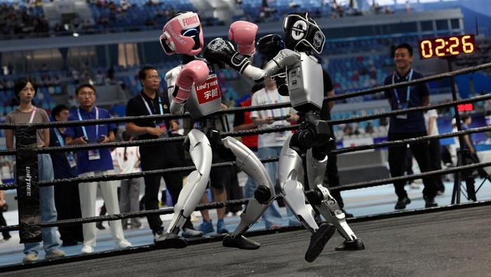 Robot humanoid Unitree Robotics bertarung dalam laga kickboxing di World Humanoid Robot Games perdana di National Speed Skating Oval, Beijing, China, Jumat (15/8/2025). Pertandingan ini memperlihatkan kemampuan robot dalam melakukan koordinasi gerak cepat. REUTERS/Tingshu Wang Β
