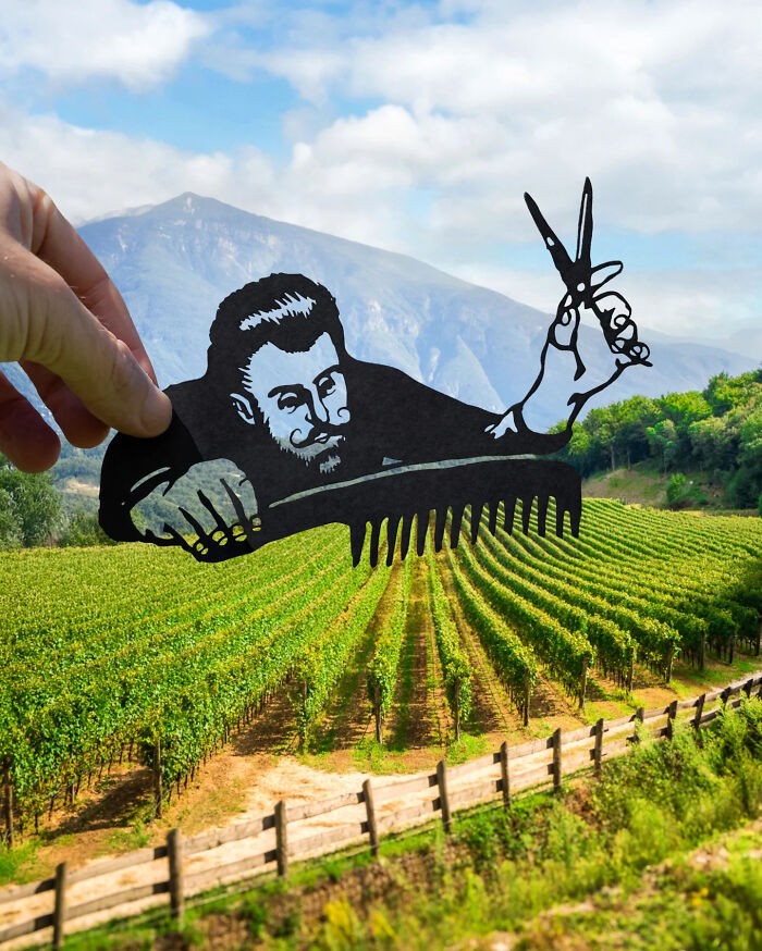 Setiap fotonya memadukan pemandangan nyata dengan imajinasi dan humor. Foto: @paperboyo via BoredPanda