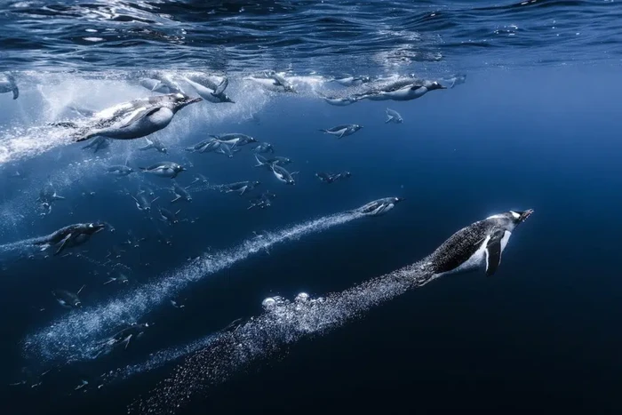 βPelabuhan Charcot biasanya merupakan tempat yang baik untuk ini. Teluk terlindung yang dikelilingi pegunungan dan gunung es ini merupakan tempat yang sempurna bagi gentoo. Kami melabuhkan perahu layar kami di teluk ini selama tiga hari, dekat koloni. Kami turun ke air setiap hari untuk menikmati pemandangan burung-burung yang sangat ingin tahu ini, yang datang untuk memeriksa kami berkali-kali. Meskipun canggung di darat, burung-burung ini cepat dan lincah di air.β Foto: Ocean Photographer of the Year