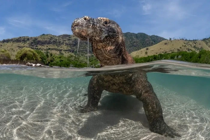 βFokus kami adalah untuk menyoroti interaksi komodo dengan salah satu habitat utamanyaβnamun seringkali terabaikanβ: garis pantai. Sebagai hewan berdarah dingin, komodo bergantung pada sumber eksternal untuk mengatur suhu tubuhnya. Saat cuaca panas terik, mereka dapat terlihat beristirahat di air dangkal atau lumpur untuk menurunkan suhu tubuh. Sebagai perenang yang mahir, mereka juga akan berenang atau berjalan melintasi dasar laut untuk memperluas wilayah teritorial mereka, mencari makanan atau pasangan.β Foto: Ocean Photographer of the Year