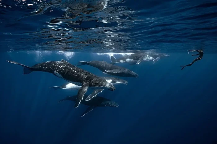 βSaya sangat beruntung di hari pertama di laut. Kami melihat 15 paus bersosialisasi selama kurang lebih 45 menit. Lautnya memang ganas, tetapi ketika Anda melihat sesuatu seperti itu, Anda akan langsung lupa kondisinya. Ada tiga orang di dalam air, menyebar karena aksi tersebut. Paus-paus itu mulai menjauh ketika saya tiba-tiba melihat teman saya menyelam bebas dari kejauhan. Saya berhasil memotretnya dikelilingi paus.β Foto: Ocean Photographer of the Year